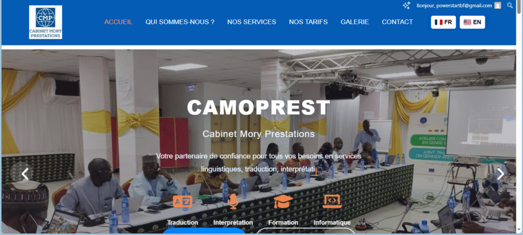Cabinet de services linguistiques, formation et accompagnement professionnel Client : CAMOPREST — Ouagadougou, Burkina FasoType de projet : Site vitrine & communication digitaleAnnée : 2025 Contexte 🧩CAMOPREST (Cabinet Mory Prestations) est une structure spécialisée dans les services linguistiques professionnels, interprétation, formation en langues, informatique et communication, ainsi que des services d’accompagnement technique et éducatif pour